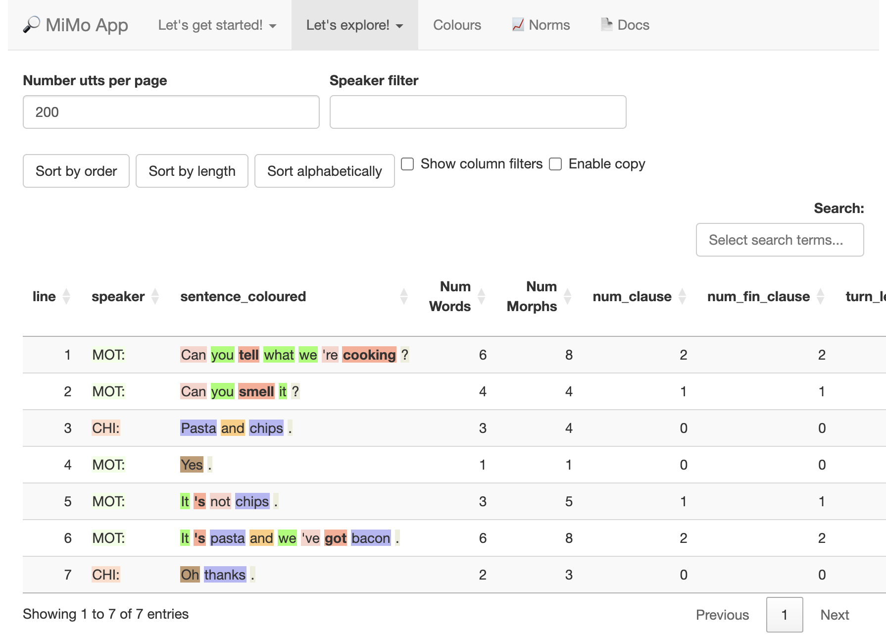 MiMo, buy contrast, allows the user to explore their data. You can quickly and easily search for particular word classes, or grammatical phenomena. You can quickly identify the longer and more complex structures that a child produces. You can sort alphabetically to find rote-learned patterns that an individual is particularly dependent on. And these are just some of the things you can do!