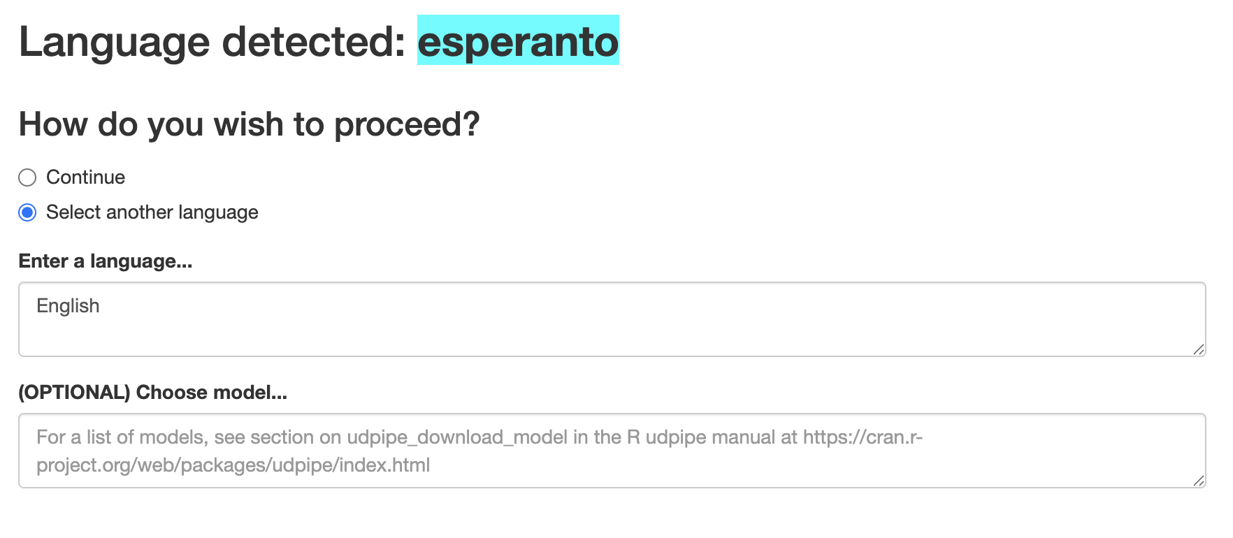 You’ll note that you also have the option to select a specific grammar from the Universal Dependencies framework. There are a number of different grammars for each language. I am not sure why anyone would wish to do this, as the default grammar is often chosen for good reasons. But it’s always good to have options!