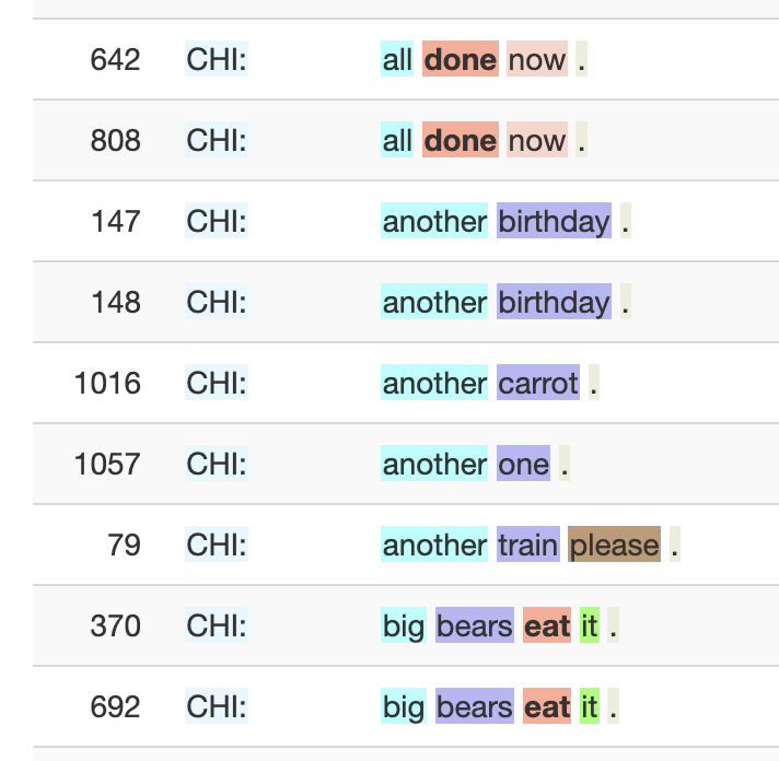 Below, data from the CHILDES Thomas corpus has been sorted “alphabetically”. “Thomas” is aged 2 years and 6 months at the time the data were collected. We can see that alphabetical sorting can be used to identify frequent rote-learned utterances, e.g. All done now, or slot-and-frame patterns, e.g. Another X.